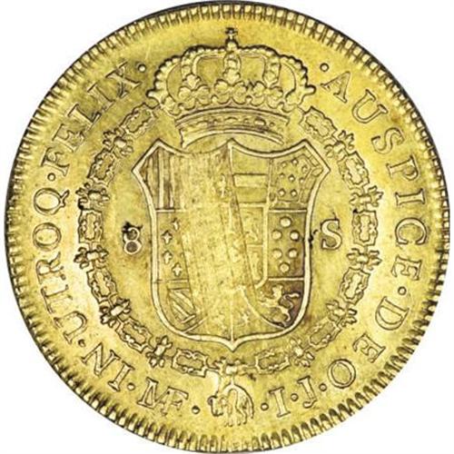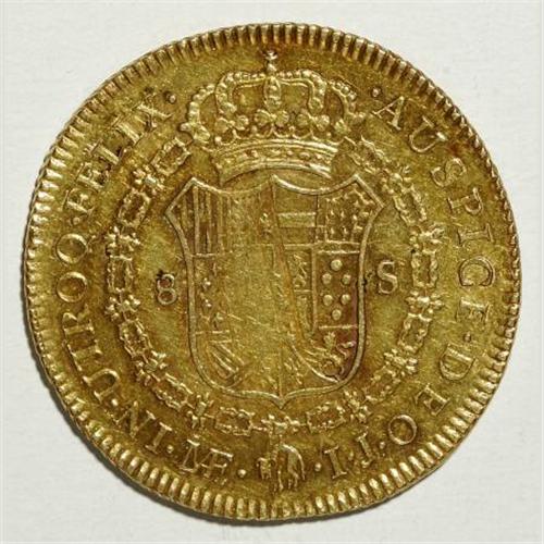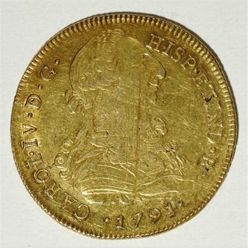 <B>Carlos IV gold 8 Escudos 1791-IJ,</B></I> KM92, lightly toned AU, bold features and abundant original mint luster. Both sides display adjustment marks across the center, not unusual for this era. Scarce transitional type with the title of Carlos IV and bust of Carlos III.<BR><BR><b>Shipping:</b> Coins & Currency (<a target="_blank" href="http://www.heritageauctions.com/common/shipping.php">view shipping information</a>)