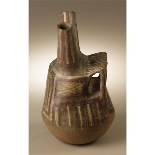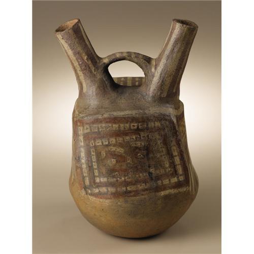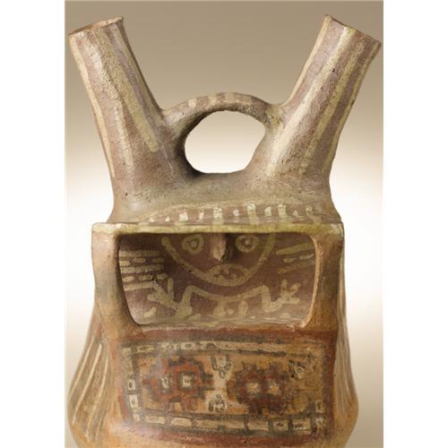 <B>Double-spout Bridge-handle Vessel</B></I><BR>Central Coast, Peru<BR>A.D. 400 - 800<BR>Buff ceramic, slip<BR>Height 10 1/2 in. Width (at spout) 6 3/8 in.<BR><BR>Two uses of slips are combined in this vessel. The slipped areas on the body of the vessel in buff, white, and brownish-red are burnished, while the areas of rapidly executed broad white-line work (which include the schematic figure inside the structure) remain unburnished. A shed-roofed structure with front corner posts is incorporated into the upper vessel body. Inside this a rapidly brushed figure with spread arms and legs is placed as though seated. Only the nose has been modeled three-dimensionally, contrasting with the otherwise wholly painted décor. The vessel is in sound condition, with minor repairs to the proper left of the structure.<BR><BR>Provenance<BR>Bonhams & Butterfields, San Francisco: sale 7437E, 9 June 2003, lot 5079, pp.18-19<BR><BR>