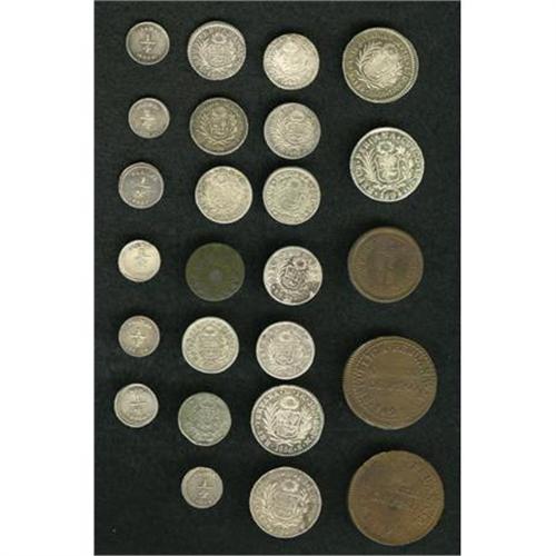 <B>Early Republic Minors Selection 1822-1856,</B></I> Provisional Copper Types (4); KM143 Lima 1/4 Reals (7); 1/2 Reals Cuzco (4) and Lima (6); and 1 Reals Cuzco (1) and Lima (3). Grades range from Fine to XF with no damaged (holed or mounted) examples. <B>Sold as is, no return lot.</B></I><BR><BR><b>Shipping:</b> Coins & Currency (<a target="_blank" href="http://www.heritageauctions.com/common/shipping.php">view shipping information</a>)
