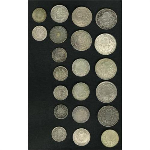 <B>Early Republic Silver Selection 1827-1855,</B></I> a nice selection of 2, 4 and 8 Reales as follows: 2 Reales Lima (3) and Cuzco (2); 4 Reales Lima (1), Cuzco (2) and Pasco (3); 8 Reales Lima (5) and Cuzco (1); North Peru 8 Reales (1); South Peru 2 Reales Sunface (2), and 4 Reales Arequipa (1 holed). Grades are generally Fine to XF and undamaged except as noted. <B>Sold as is, no return lot.</B></I><BR><BR><b>Shipping:</b> Coins & Currency (<a target="_blank" href="http://www.heritageauctions.com/common/shipping.php">view shipping information</a>)