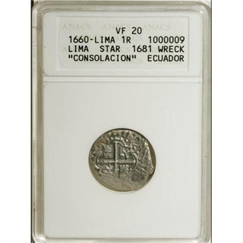 <B>Felipe IIII cob Real 1660 Star of Lima,</B></I> KM15, Cayon 5812, VF20 ANACS, lightly oxidized surfaces, from the wreck of the "Consolacion," which sank in 1681. Very rare date.<BR><BR><b>Shipping:</b> Coins & Currency (<a target="_blank" href="http://www.heritageauctions.com/common/shipping.php">view shipping information</a>)
