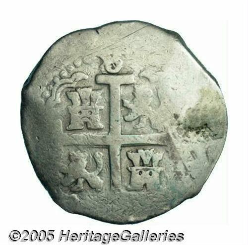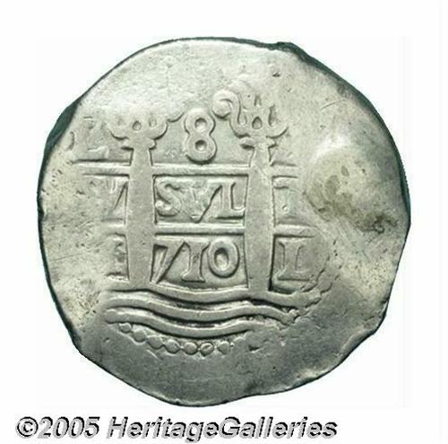 <B>Felipe V 8 Reales 1710-H, </B></I>KM34, Calbeto 286, very rare date and the key to this entire series. Bold VF with a very clear date and struck on a nearly round flan. Holed and plugged at 3 o'clock on the obverse.