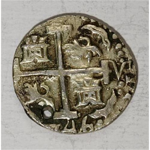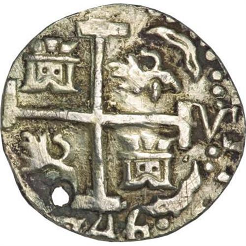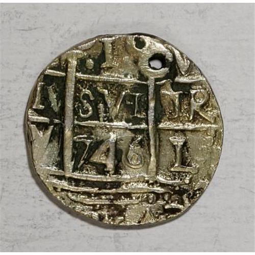 <B>Felipe V Royal 1 Real 1746L-V,</B></I> KM-R31a (unlisted date), crude XF, lightly gilt and holed at the top, extremely rare presentation strike on a fully round planchet, well-centered with a second date 746 and assayer V visible on the reverse. 3.25 grams. The reverse legend includes HIL which would indicate Philippus in this transitional year.<BR><BR><b>Shipping:</b> Coins & Currency (<a target="_blank" href="http://www.heritageauctions.com/common/shipping.php">view shipping information</a>)