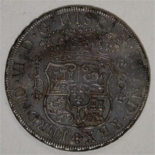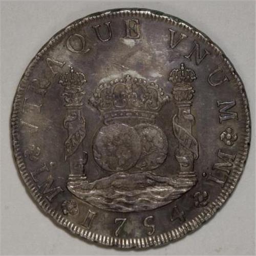 <B>Ferdinand VI Pillar 8 Reales 1754-JD,</B></I> KM55.1, nicely detailed XF-AU, cleaned and at one time and now with blue-gray patina.<BR><BR><b>Shipping:</b> Coins & Currency (<a target="_blank" href="http://www.heritageauctions.com/common/shipping.php">view shipping information</a>)