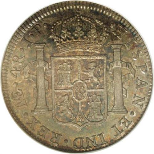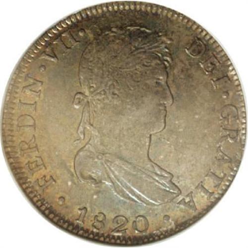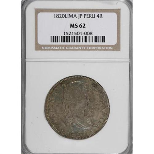 <B>Ferdinand VII 4 Reales 1820-JP,</B></I> KM116, MS62 NGC, very nicely struck for this era with a full cloak button, attractively toned with blue-green and russet patina.<BR><BR><b>Shipping:</b> Coins & Currency (<a target="_blank" href="http://www.heritageauctions.com/common/shipping.php">view shipping information</a>)