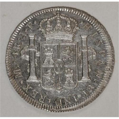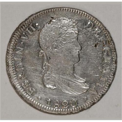 <B>Ferdinand VII 4 Reales 1820-JP,</B></I> KM116, choice lustrous AU, unusually sharp details for this era, few superficial dark spots in the obverse field. Scarce grade for this denomination.<BR><BR><b>Shipping:</b> Coins & Currency (<a target="_blank" href="http://www.heritageauctions.com/common/shipping.php">view shipping information</a>)