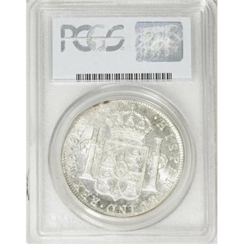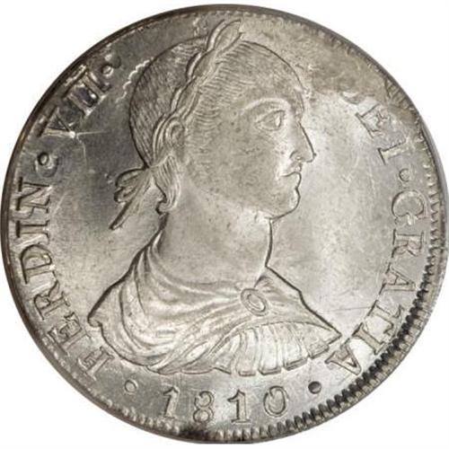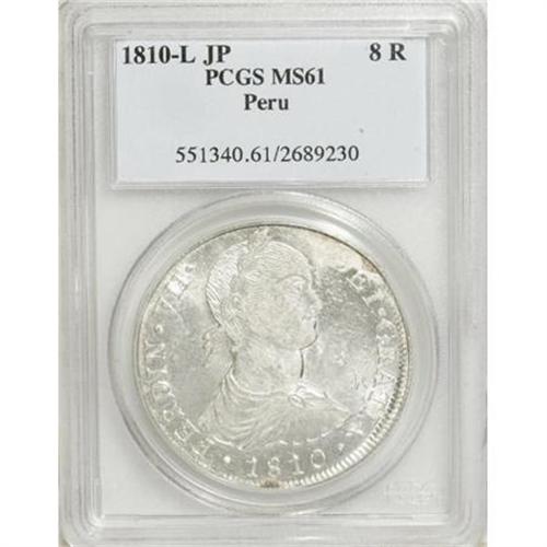 <B>Ferdinand VII 8 Reales 1810-JP,</B></I> KM106.2, Lima bust, MS61 PCGS, full frosty white mint brilliance, natural flan flaw at 1 o'clock on the obverse causing a weak strike on the assayer's initials on the reverse. The centrals details are quite bold and this type is seldom encountered in true mint state.<BR><BR><b>Shipping:</b> Coins & Currency (<a target="_blank" href="http://www.heritageauctions.com/common/shipping.php">view shipping information</a>)