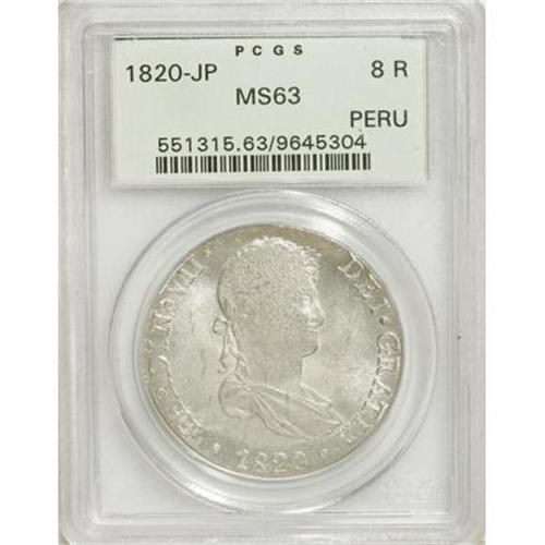 <B>Ferdinand VII 8 Reales 1820-JP,</B></I> KM117.1, MS63 PCGS, fully lustrous but weakly struck causing a frosty appearance to the surfaces. Very scarce in true mint state.<BR><BR><b>Shipping:</b> Coins & Currency (<a target="_blank" href="http://www.heritageauctions.com/common/shipping.php">view shipping information</a>)