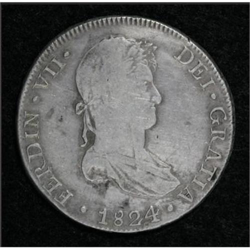 <B>Ferdinand VII 8 Reales 1824-T Cuzco,</B></I> KM117.2, nice toned F-VF, typically weak on the bust and correspondingly strong on the reverse coat of arms, a defect free example of this very scarce branch mint royalist type.<BR><BR><b>Shipping:</b> Coins & Currency (<a target="_blank" href="http://www.heritageauctions.com/common/shipping.php">view shipping information</a>)
