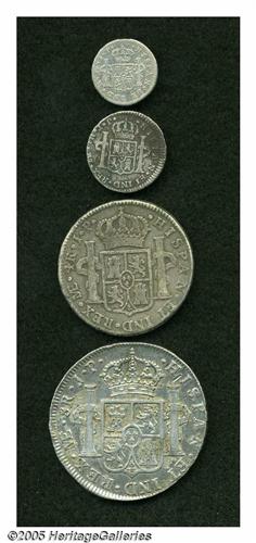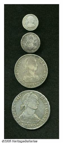 <B>Ferdinand VII Imaginary Bust Types, </B></I>KM103.2, 1/2 Real 1810-JP, nice Fine, scarce, KM109 Real 1810-JP, Fine, considerable dark oxidation, KM105.2 4 Reales 1811-JP, lightly toned F+, very attractive and scarce, and KM106.2 8 Reales 1810-JP, sharp VF-XF, very bold details, minor pitting on the reverse. <B>Sold as is, no return lot.</B></I>