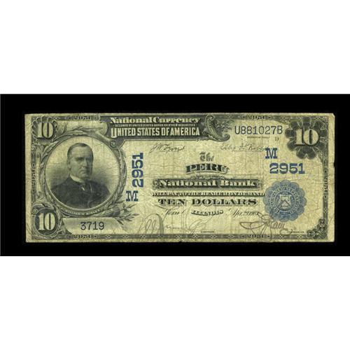 <B>Peru, IL</B></I> - $10 1902 Plain Back Fr. 624 <B>The Peru NB</B></I> Ch. # (M)2951<BR>This LaSalle County bank failed during the depression in 1934, leaving the community without a National Bank. The ink signatures remain quite readable. <B>Very Good.</B></I><BR><I>From The Lincoln Collection</B></I><BR><BR><b>Shipping:</b> Coins & Currency (<a target="_blank" href="http://www.heritageauctions.com/common/shipping.php">view shipping information</a>)