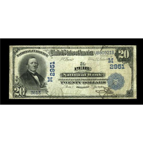 <B>Peru, IL</B></I> - $20 1902 Plain Back Fr. 650 <B>The Peru NB</B></I> Ch. # (M)2951<BR>It has been a couple of years since a large size note from here has been available. Neat pen signatures with a few minor margin nicks. <B>Fine.</B></I><BR><I>From The Lincoln Collection</B></I><BR><BR><b>Shipping:</b> Coins & Currency (<a target="_blank" href="http://www.heritageauctions.com/common/shipping.php">view shipping information</a>)