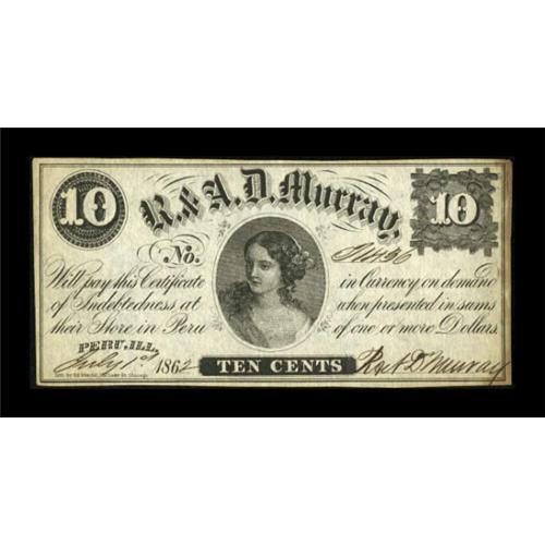<B>Peru, IL-R. & A.D. Murray </B></I>10¢ July 1, 1862 <BR> The first in a set of five different denominations from this very scarce Illinois issuer. <B>Uncirculated, </B></I>with a bit of foxing at the right end. <BR><BR><b>Shipping:</b> Coins & Currency (<a target="_blank" href="http://www.heritageauctions.com/common/shipping.php">view shipping information</a>)