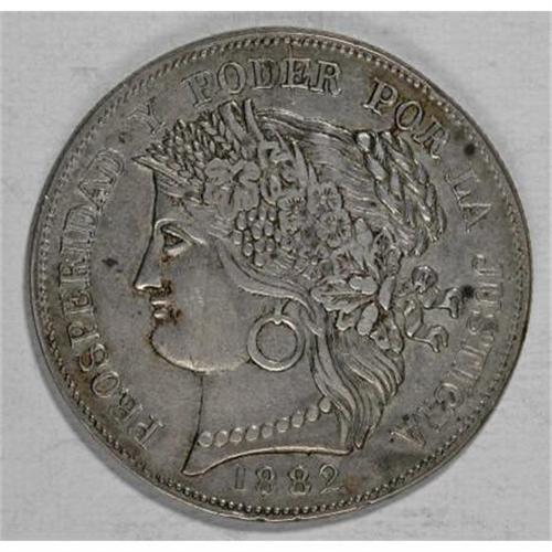<B>Republic 5 Pesetas 1882 Ayacucho,</B></I> KM201.3, toned VF-XF, tiny rim nick. Very scarce.<BR><BR><b>Shipping:</b> Coins & Currency (<a target="_blank" href="http://www.heritageauctions.com/common/shipping.php">view shipping information</a>)