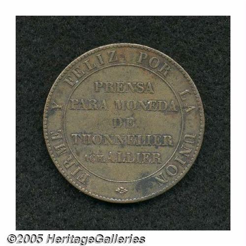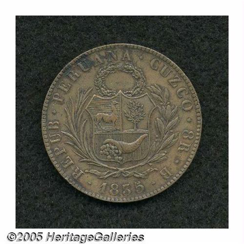 <B>Republic Copper Pattern (1835), </B></I>Thonnelier private issue "pattern" advertising new minting machines. The reverse features a copy of the die for an 8 Reales 1835-B Cuzco. Plain edge. Very scarce. Glossy brown XF, tiny bit of patination by the U in PERUANA.