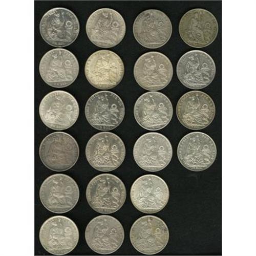 <B>Republic - Nice Collection of Silver Sols,</B></I> twenty-two coins featuring: 1864/54YB XF-AU, 1865YB AU small rim nick, 1872YJ XF, 1874YJ choice BU, 1879YJ XF, 1880YJ AU-UNC, 1882BF UNC, 1887TF UNC, 1888TF (2), XF and AU, 1891TF XF, "1393TF" error with 3 punched over 8 (2), VF and AXF, 1896TF cleaned XF, 1914FG AU, 1915FG XF, 1916FG AU, 1923 with fineness, VF+, 1923 without fineness, AVF, 1933 XF, 1934 AU and 1935 BU. An excellent starter collection of these Latin crowns. <B>Sold as is, no return lot.</B></I><BR><BR><b>Shipping:</b> Coins & Currency (<a target="_blank" href="http://www.heritageauctions.com/common/shipping.php">view shipping information</a>)