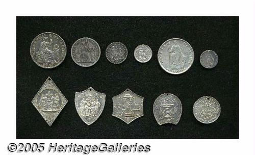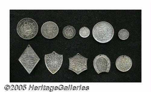 <B>Republic Transitional Types, </B></I>KM177, 1/2 Real 1858, porous AVF, scarce, KM178 50 Centimos 1858, lightly cleaned VF, KM180 1/2 Real 1860, XF, KM181 Real 1860, toned VF-XF, KM182 25 Centavos 1859, Fine, scarce, and KM179.2 50 Centavos 1859, long hair variety, toned XF+, tiny edge bump, plus five small silver medalets, all 1886-1899, choice XF, holed, all different shapes. <B>Sold as is, no return lot.</B></I>