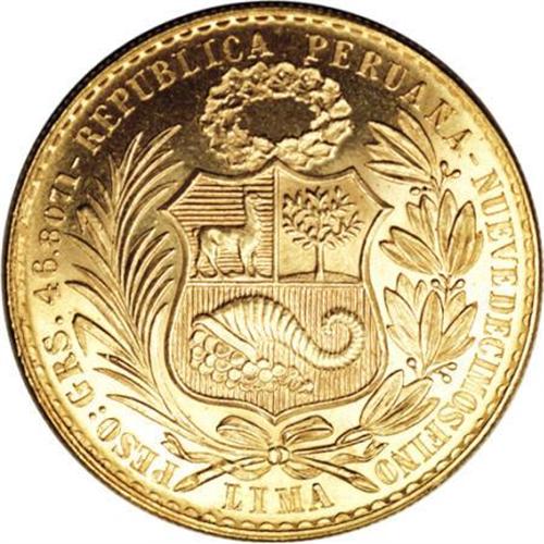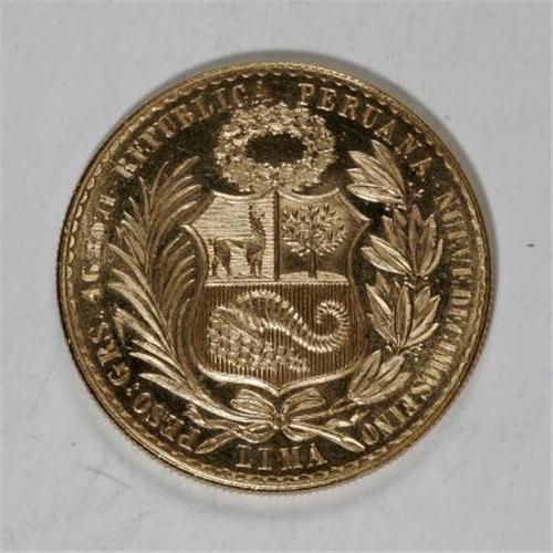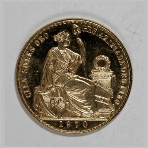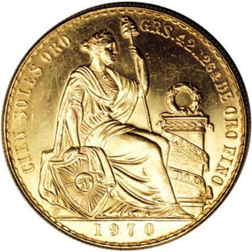 <B>Republic gold 100 Soles 1970,</B></I> KM231, choice brilliant UNC, tiny mintage of 425, very rare date.<BR><BR><b>Shipping:</b> Coins & Currency (<a target="_blank" href="http://www.heritageauctions.com/common/shipping.php">view shipping information</a>)