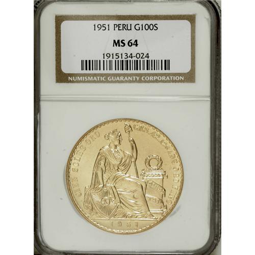 Peru: Republic gold 100 Sols 1951, KM-231, MS64