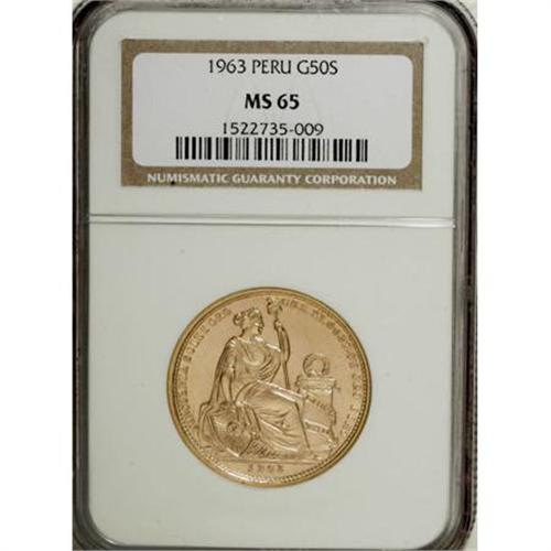 <B>Republic gold 50 Soles 1963,</B></I> KM230, MS65 NGC, fully lustrous.<BR><BR><b>Shipping:</b> Coins & Currency (<a target="_blank" href="http://www.heritageauctions.com/common/shipping.php">view shipping information</a>)