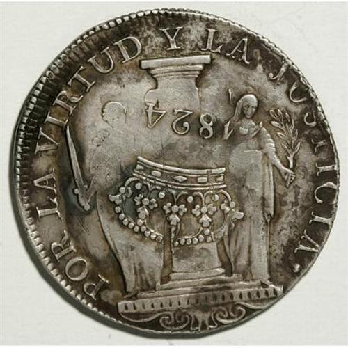 <B>Royalist 8 Reales 1824,</B></I> KM130, large crown over 1824 counterstamp on an 1823JP Republican 8 Reales KM136. The host coin is nice VF and the counterstamp is unusually sharp. The surfaces have been cleaned at one time and some light oxidation remains.<BR><BR><b>Shipping:</b> Coins & Currency (<a target="_blank" href="http://www.heritageauctions.com/common/shipping.php">view shipping information</a>)
