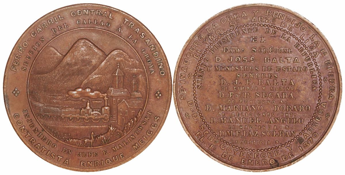 Peru, large bronze medal, 1870, Central Transandine Railroad (Callao to Oroya). 67.58 grams, 51mm. Obverse shows a steam locomotive proceeding through a town with mountains in background and reverse shows a long inscription (listing the chief engineer, plus President Balta and various government ministers), commemorating the opening of the Central Transandine Railroad on January 10, 1870. AU, light-even brown in color.