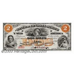 <TABLE cellSpacing=0 cellPadding=0 width="100%" bgColor=#000000 border=0><TBODY> <TR><TD width="100%"><TABLE cellSpacing=1 cellPadding=3 width="100%" border=0><TBODY><TR><TD width="100%" bgColor=#79735c><FONT face=arial color=#ffffff size=3><B>Description</B> </FONT></TD></TR><TR><TD width="100%" bgColor=#ffffff><FONT face=arial size=2><B>Peru</B></I> El Banco de Londres Mexico y Sud America 1866 2 soles Pick S271 Specimen<BR>An extremely rare specimen note that was printed by the American Bank Note company and is unpriced in Pick, which simply lists this note as "Rare." Crisp Uncirculated, with two small POCs, and certainly rare enough to draw interest from specialized collectors of South American currency or collectors of Mexican bank issues, with which this issue is affiliated. </FONT></TD></TR></TBODY></TABLE></TD></TR></TBODY></TABLE><BR><A name=PricesRealized></A><TABLE cellSpacing=0 cellPadding=0 width="100%" bgColor=#000000 border=0><TBODY><TR><TD width="100%"><TABLE cellSpacing=1 cellPadding=3 width="100%" border=0><TBODY><TR><TD width="100%" bgColor=#79735c><A name=PR><FONT face=arial color=#ffffff size=3><B>Previous Prices from Heritage Auctions</B> </FONT></A></TD></TR><TR><TD bgColor=#f6f6ed>No Prior Data Recorded </TD></TR><TR><TD bgColor=#ffffff><FONT face=arial size=1 ?>PLEASE NOTE: All prices realized reflect the final hammer price PLUS the buyer's premium in auctions that charge a buyer's premium. Each item has a notation at the top of the listing indicating whether that lot included a buyer's premium. Example: A item that sells with a final hammer price of $100 and a 20% buyer's premium will display with a price realized of $120. All information listed is intended to be as accurate as possible, but errors are possible. Please use this guide carefully and inform us of any inaccuracies. </FONT></TD></TR></TBODY></TABLE></TD></TR></TBODY></TABLE><BR><TABLE cellSpacing=0 cellPadding=0 width="100%" bgColor=#000000 border=0><TBODY><TR><TD width="100%"><TABLE cellSpacing=1 cellPadding=3 width="100%" border=0><TBODY><TR><TD width="100%" bgColor=#79735c colSpan=6><FONT face=arial color=#ffffff size=3><B>Price Guide*</B> </FONT></TD></TR><TR bgColor=#f6f6ed><TD align=middle><B>Grade</B> </TD><TD align=middle><B>Coin World<BR>(Trends)</B> </TD><TD align=middle><B>Numismedia<BR>Retail</B> </TD><TD align=middle><B>Numismedia<BR>Wholesale</B> </TD><TD align=middle><B>Coin<BR>Universe</B> </TD><TD align=middle><B>Heritage<BR>Value Index</B> </TD></TR><TR bgColor=#ffffff><TD colSpan=6><FONT size=1>*All information listed is intended to be as accurate as possible, but errors are possible. No item may be returned or refused based on this information which is provided as a service to our customers. You should contact each pricing source directly to determine the accuracy of this information. </FONT></TD></TR></TBODY></TABLE></TD></TR></TBODY></TABLE><BR><TABLE cellSpacing=0 cellPadding=0 width="100%" bgColor=#000000 border=0><TBODY><TR><TD width="100%"><TABLE cellSpacing=1 cellPadding=3 width="100%" border=0><TBODY><TR><TD width="100%" bgColor=#79735c><FONT face=arial color=#ffffff size=3><B>Population Guide</B> </FONT></TD></TR><TR bgColor=#ffffff> Important notice: Heritage usually auctions material at the rate of 200-250 lots per hour. On some occasions eBay Live bid software or the Internet may not be able to keep up with the pace of the auction. We recommend placing a realistic absentee bid now as insurance to avoid disappointment. Occasionally the auctioneer may eliminate or reject an eBay Live bid, and the auctioneer may also reopen a lot after the close of the eBay live bidding (usually because we missed an audience bid), and may reject your bid even if it shows you as the winning bidder. By bidding via eBay Live, you agree that Heritage may award the lot to another bidder at its sole discretion under the circumstances described above or any other reasonable circumstances. Also please note that all Heritage lots purchased through eBay Live carry a 20% Buyer's Premium. Please make sure you read the Terms and Conditions before you bid.</TD></TR></TBODY></TABLE></TD></TR></TBODY></TABLE>