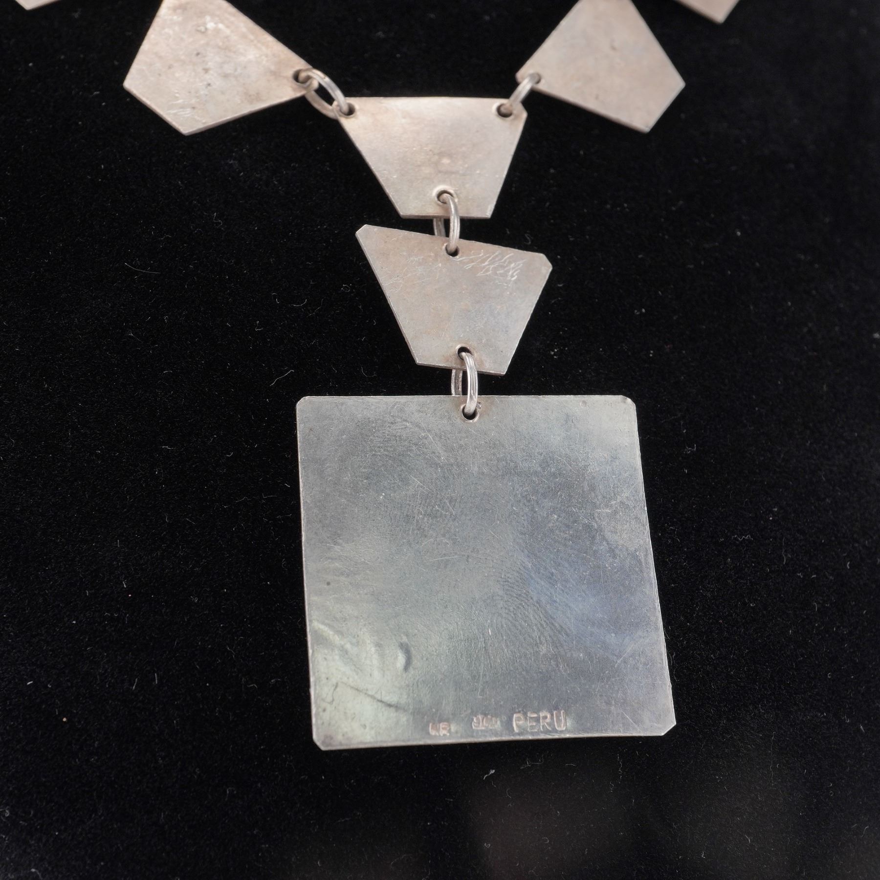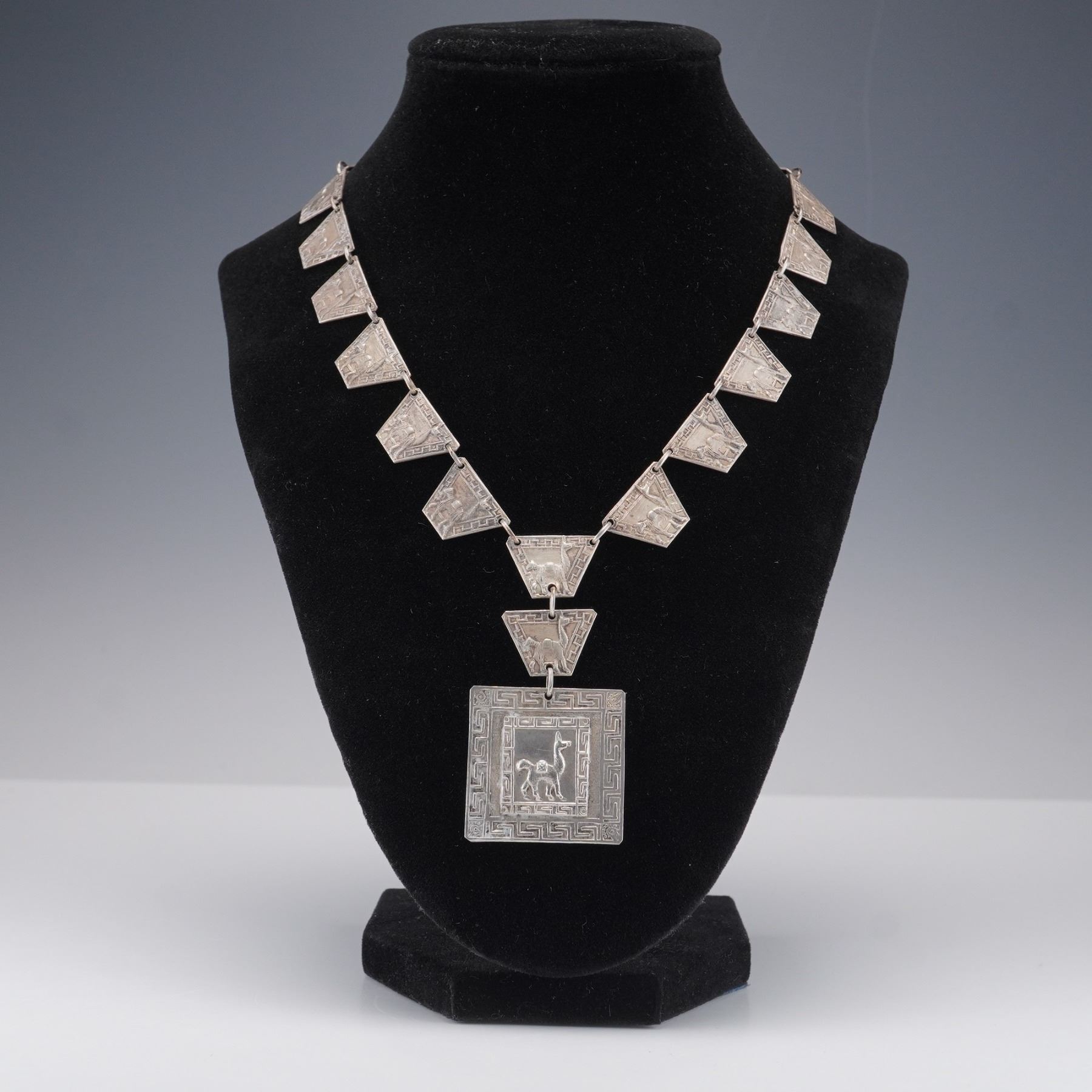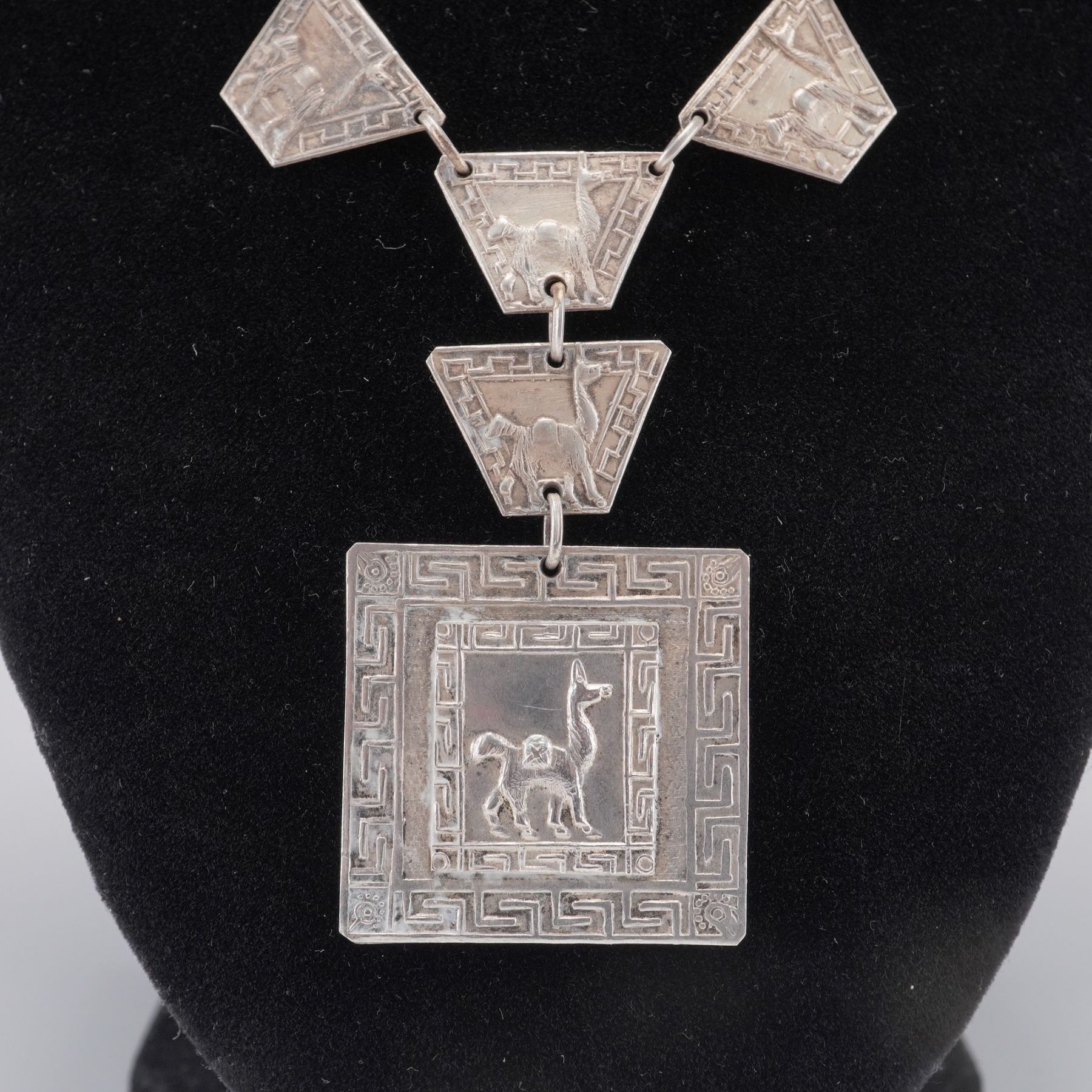 Handcrafted Peruvian necklace composed of trapezoidal panel links and a square drop medallion, each relief engraved with alpaca/llama motifs within geometric step-fret borders. Finished with a simple hook clasp. The reverse of the pendant is stamped NR 900 PERU, indicating 900 silver fineness and maker's initials. A striking Andean design with good dimensional detailing and vintage patina. Light surface wear and natural patina from age; hook clasp secure and functional. Total weight 1.3076 troy oz.