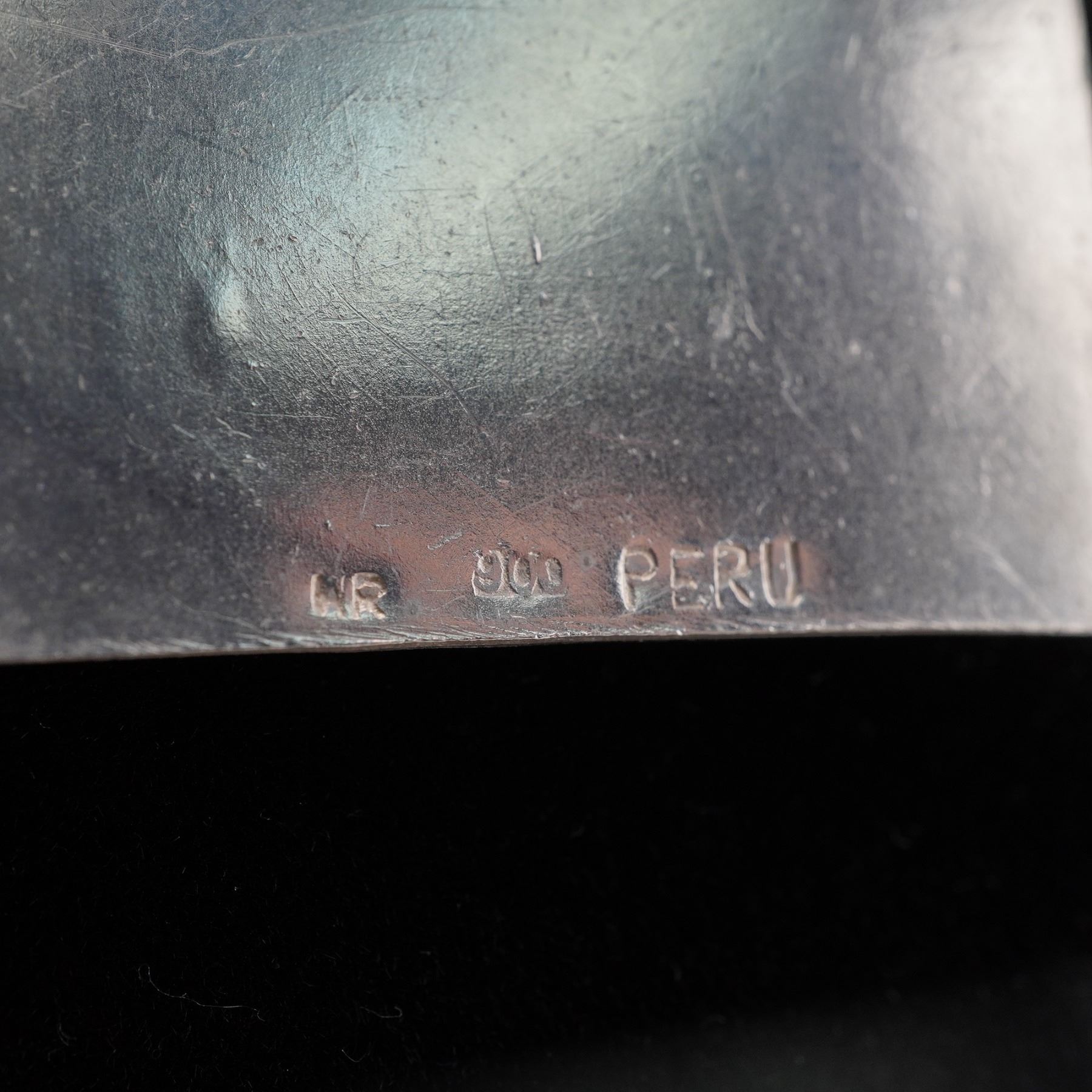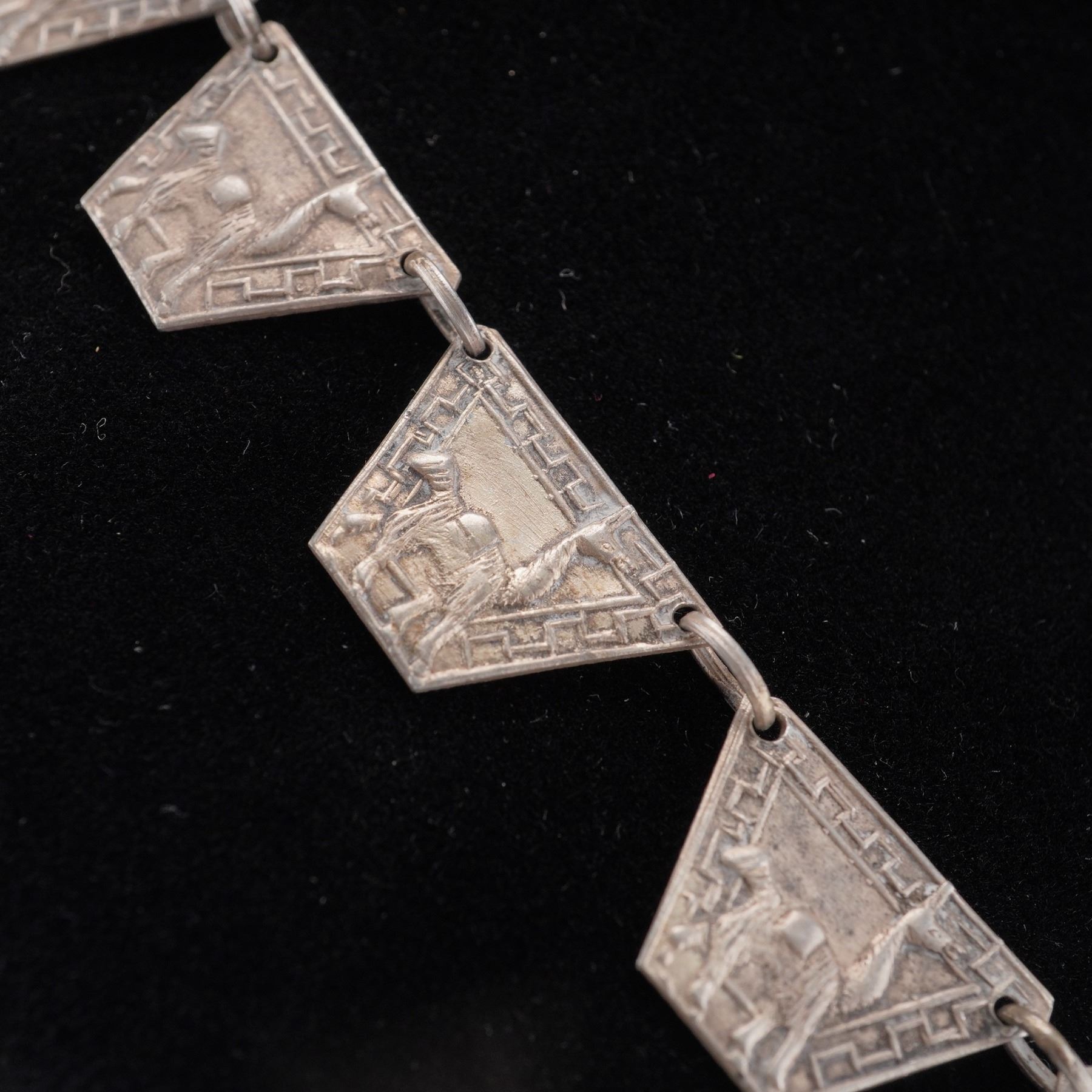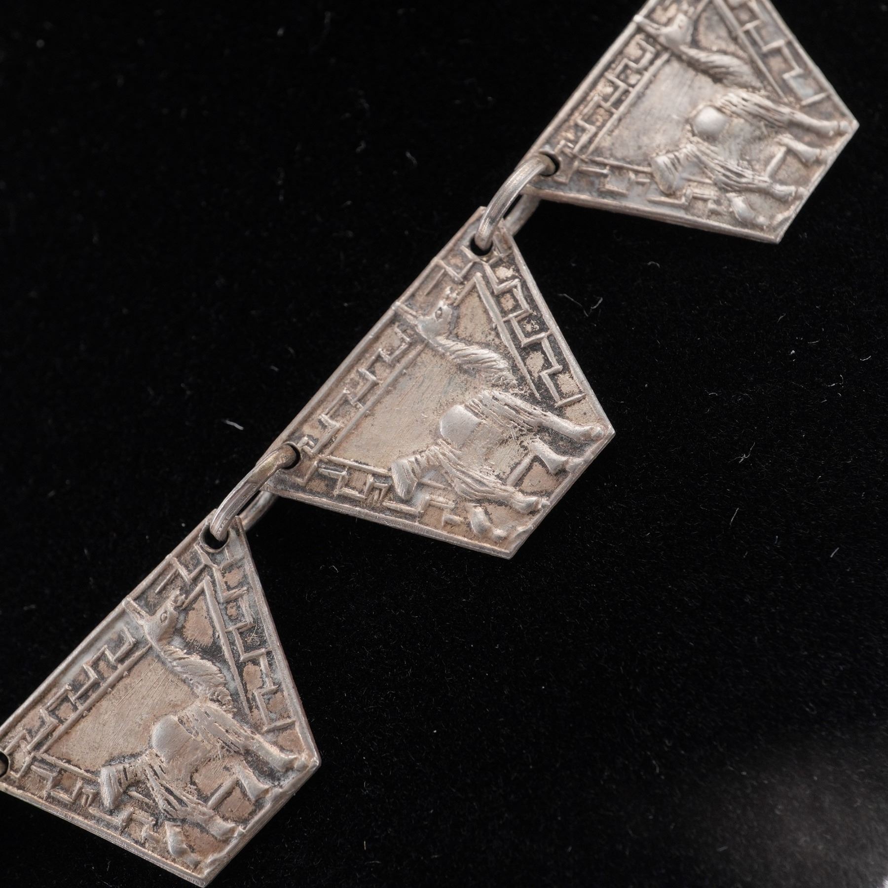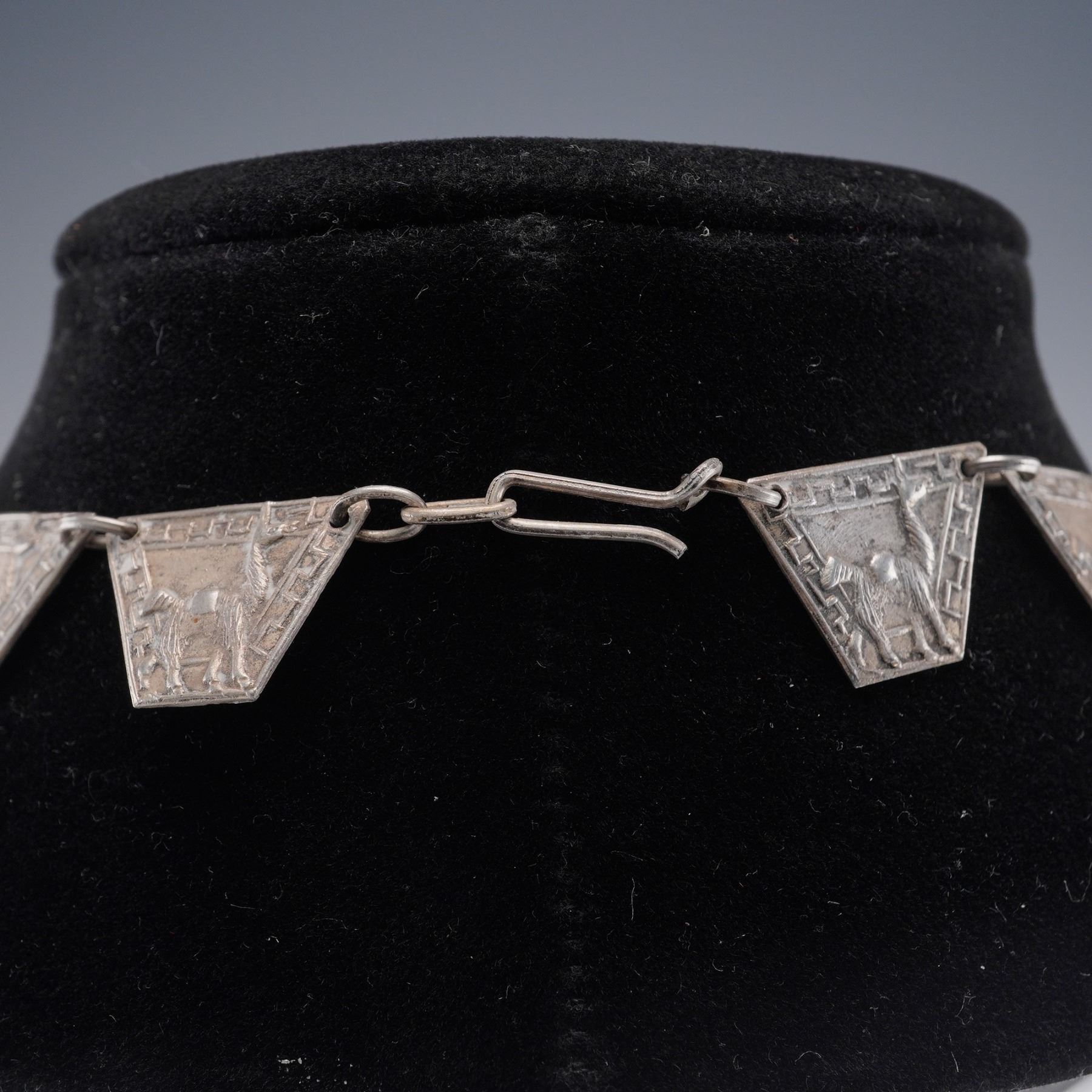 Handcrafted Peruvian necklace composed of trapezoidal panel links and a square drop medallion, each relief engraved with alpaca/llama motifs within geometric step-fret borders. Finished with a simple hook clasp. The reverse of the pendant is stamped NR 900 PERU, indicating 900 silver fineness and maker's initials. A striking Andean design with good dimensional detailing and vintage patina. Light surface wear and natural patina from age; hook clasp secure and functional. Total weight 1.3076 troy oz.