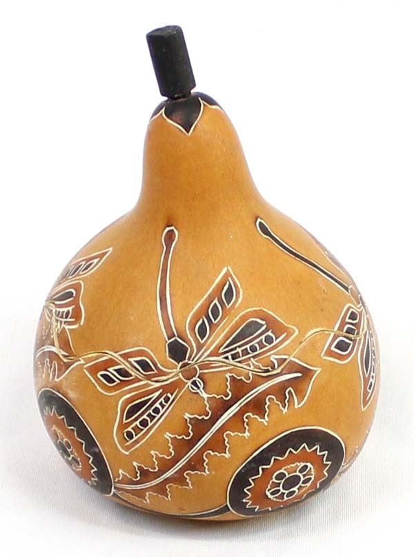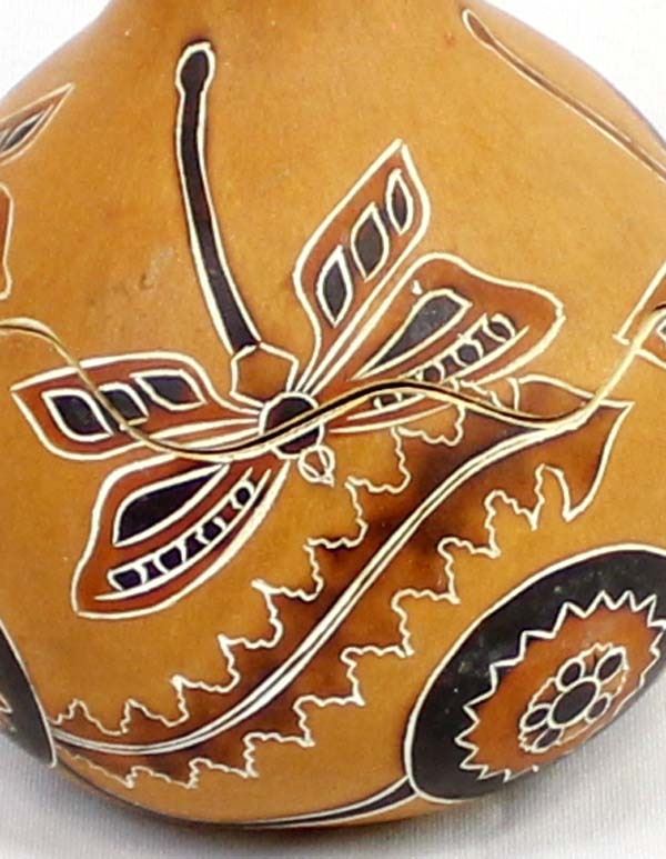Peruvian Andanzas Lidded Carved Gourd, butterfly motif, measures 4.5'' x 7'' and has original label on the bottom