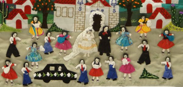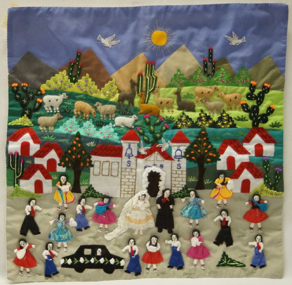Peruvian Arpillera Folk Art Cloth Wedding Scene, measures approx. 18.5H x 19''L. Double sided Cloth Folk Art with three Dimensional hand stitched applique.