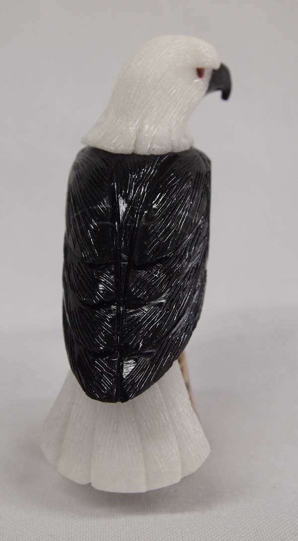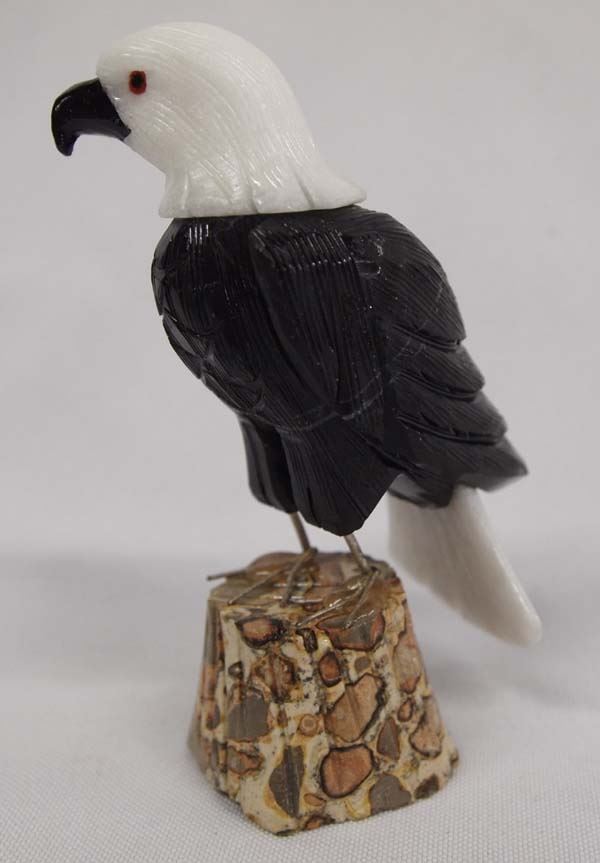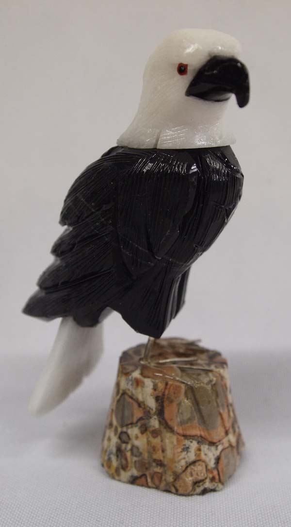Peruvian Carved Onyx and White Marble Eagle, measures 4''H and is sitting on a carved leopard skin jasper stump