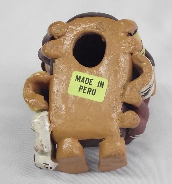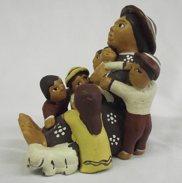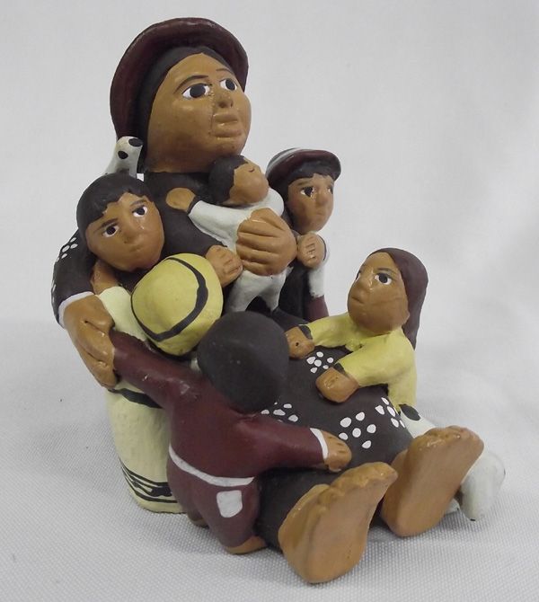 Peruvian Clay Storyteller Doll. Delightful storyteller with six children, a bird on her shoulder and a dog at her feet. In brown and white colors, this charmer measures 3.5''H x 3''W x 3''D.
