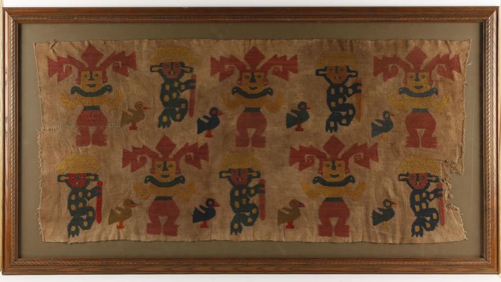 Hand embroidered. With figures. 44" wide x 21" high. Framed, under glass 52" wide x 28" high.. 100% original.