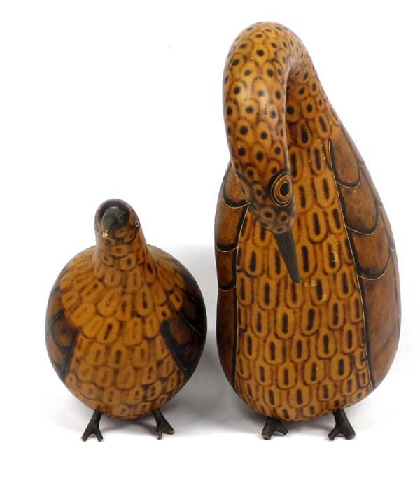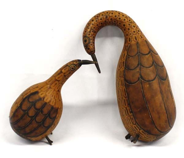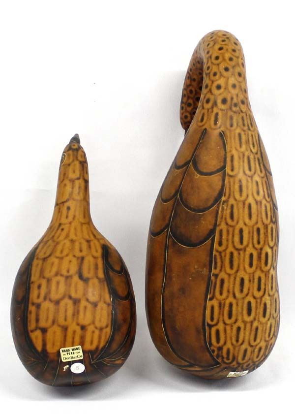 Peruvian Gourd Birds by Don Barr, made by artist Don Barr.  largest bird measures 5'' x 13''