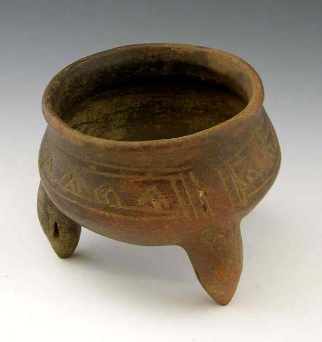Peruvian Pre-Columbian Incised Tripodal Bowl, 450-1400 A.D., from Huaca de Sol, with rattling clay beads, H.- 4 in., Dia.- 5 in.