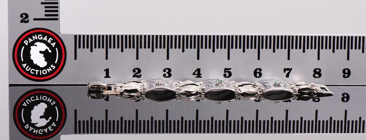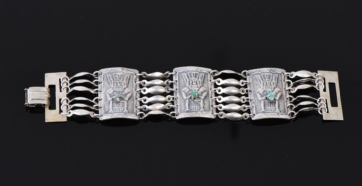 Peruvian Raw Emerald Sterling Silver Bracelet Depicting Viracocha Who Is Known As The Great Creator God in Inca Mythology. Estimated more than 50 yrs old. 925 Sterling Silver consisting of 92.5% silver and 7.5% copper. Tested Positive using Nitric Acid Chemical Scratch Test, Cloth Rub Test, Smell Test, and Magnet Test. No Markings. The reason silver needs to be combined with other metals is that it is very difficult to make great designs with just pure silver, which is very soft and malleable. A bit of hardness has to be introduced by adding other metals such as copper. That is why jewelers are capable of making the most intricate an complex designs with 925 Sterling Silver. Silver is one of the most valuable elements next to gold. Mexico is the leading producer of sliver, followed by the United States, Canada, Australia, Spain, Peru, and Russia. Many countries do not require their precious metal items to be stamped and therefore we test to ensure we accurately represent the product. Size: See Ruler Photo. (Photos Represent The Condition Of The Lot.)