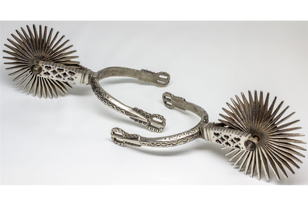 These are Peruvian morochuco riding spurs. They are ornately crafted and have multi-point severes, four inch rowel. They are reported as being silver, which it certainly appears to be, however, there are no maker or grade marks. It doesn’t take away from the beauty and craftsmanship of these pieces. - HKA#65235