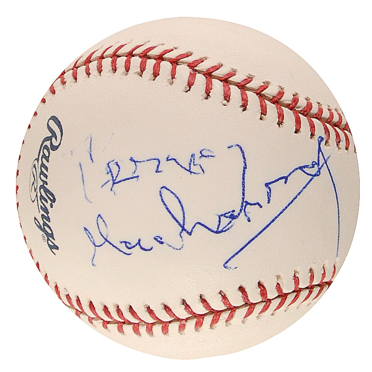 Leader of Pakistan as prime minister and president (born 1943) from October 1999 to August 2008. Official Rawlings Major League baseball signed in blue ballpoint on a side panel. In fine condition, with signature a bit shaky, and first letter of signature light but legible.