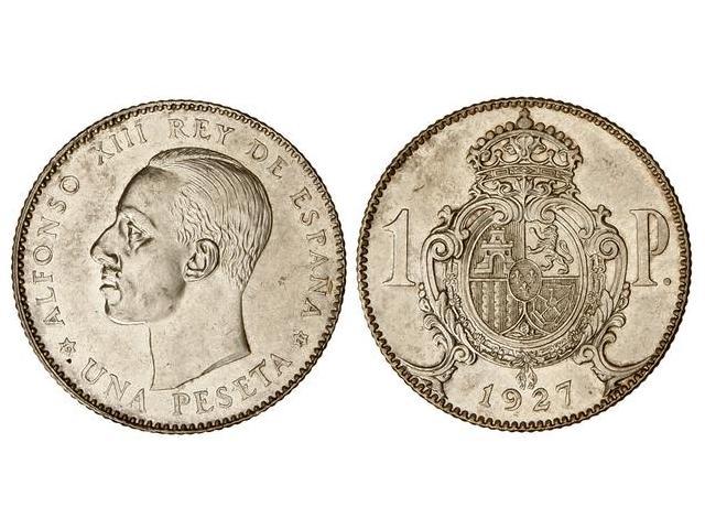 Peseta System: Alfonso Xiii - Prueba no adoptada 1 Peseta. 1927 (*19-27). 5,04 grs. AR. Ø 23 mm. Busto grande, probablemente realizado por M. Martín. Sin siglas de ensayadores y fiel de balanza. (Levísimas rayitas). RARÍSIMA. Al-160PM2. SC.