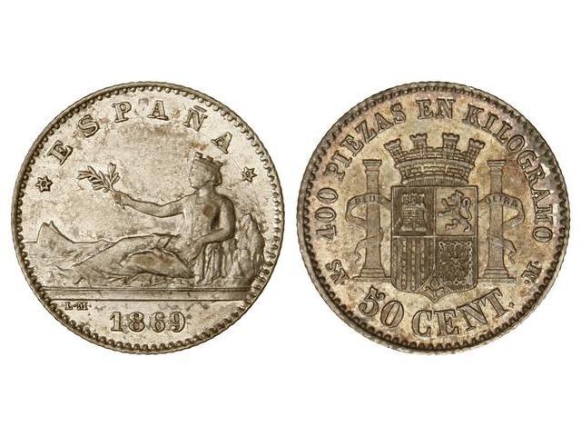 Peseta System: Provisional Government And I Republic - 50 Céntimos. 1869 (*18-69). S.N.-M. Gran parte de brillo original. Preciosa pátina en reverso. MAGNÍFICO EJEMPLAR. EBC-/EBC+.