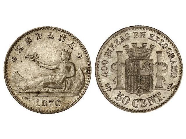 Peseta System: Provisional Government And I Republic - 50 Céntimos. 1870 (*7-0). S.N.-M. Restos de brillo original. RARA EN ESTA CALIDAD. EBC.