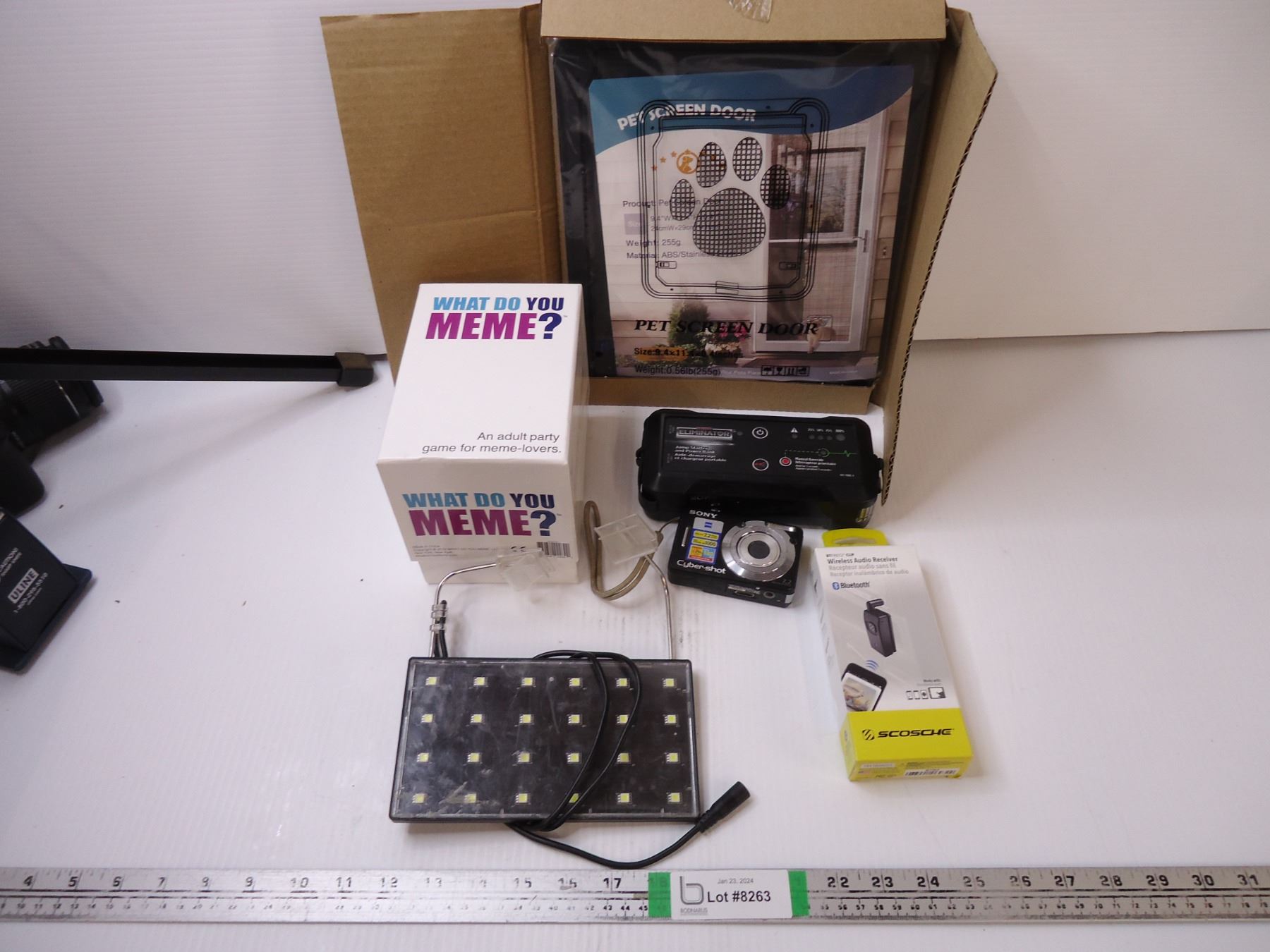 Pet Screen Door, Meme Game, Clip On LED Light, Jump Starter(missing cord),Camera(no battery) Audio receiver (untested)
