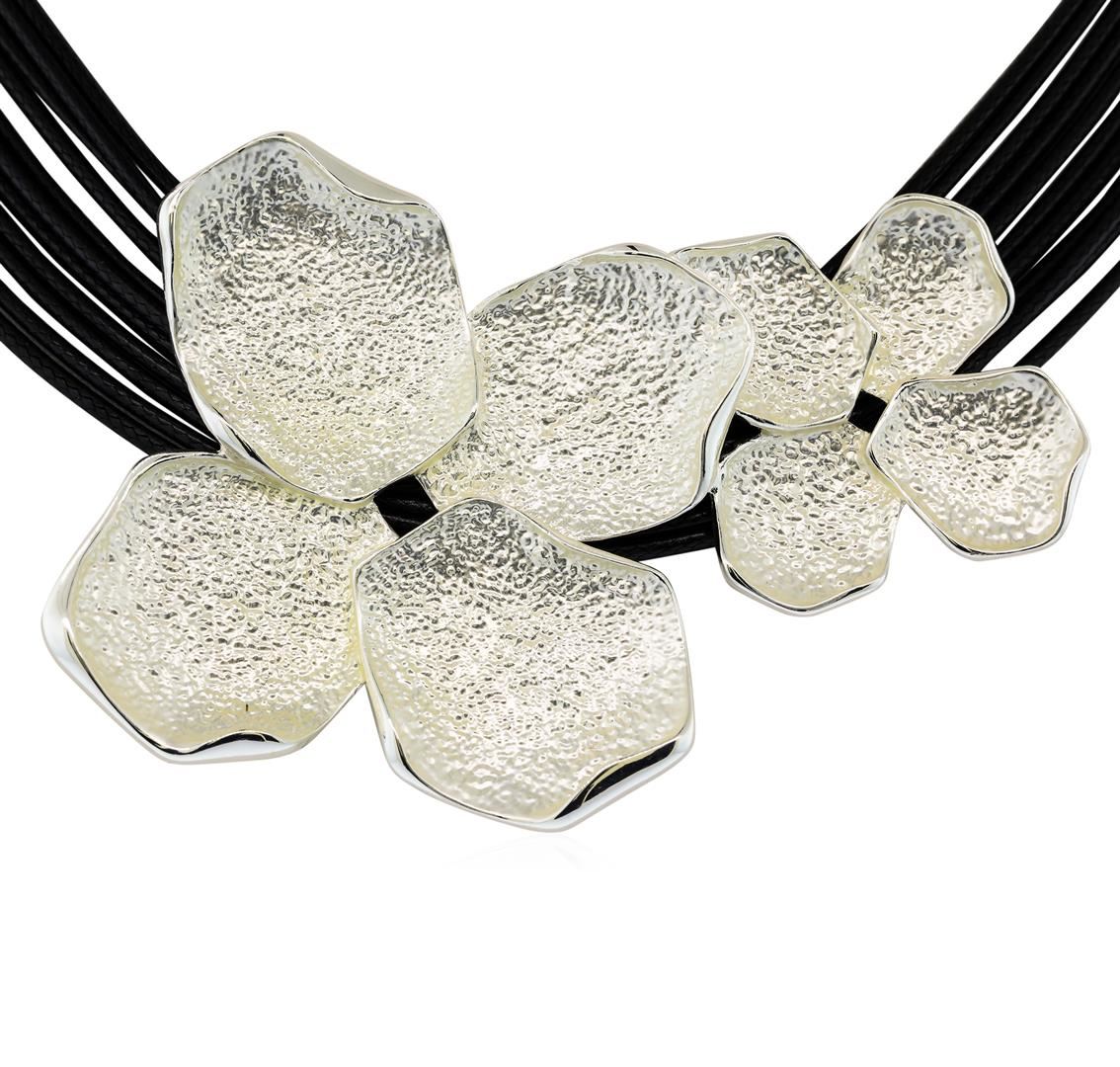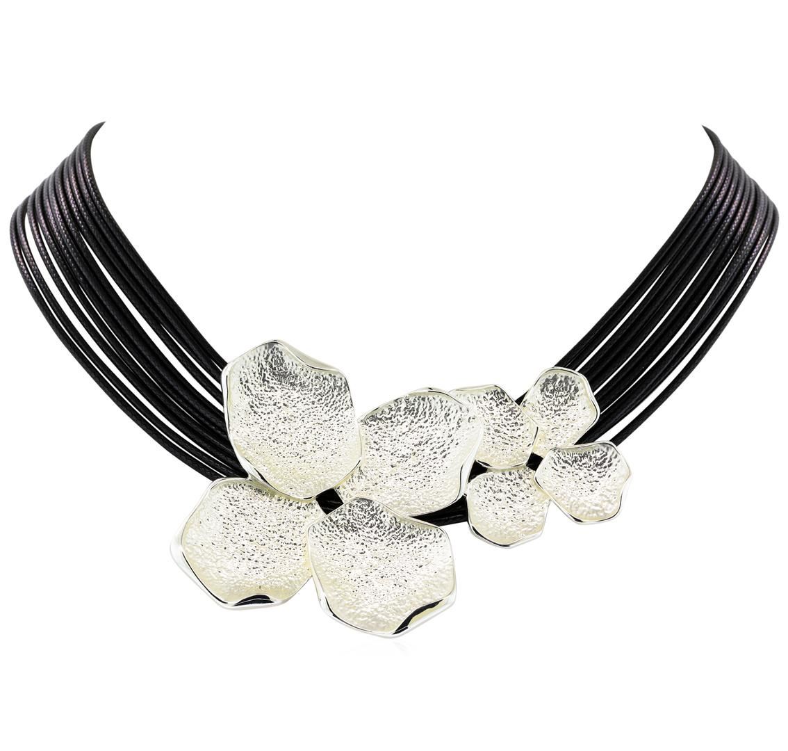 High end designer jewelry. Petal Twin Pendant Multi Strand Necklace - Rhodium Plated. Rhodium Plated/3" Ext Clasp. Silver/ Black. 16inches. Total Weight: 44.1 grams.