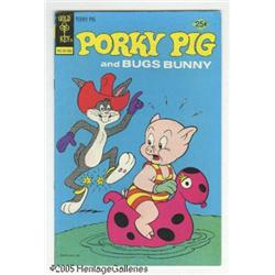 <B>Pete Alvarado (attributed) - Porky Pig and Bugs Bunny #61 Cover Original Art (Gold Key, 1975).</B></I> Porky looks a mite concerned, and rightfully so, since Bugs has donned pointed spurs in order to ride Porky's rubber pony float! A hilarious portrait of the two Warner Brothers cartoon stars interacting! The art has an image area of 10.5" x 12", and the art is in Excellent condition. A copy of the comic book is included in this lot.