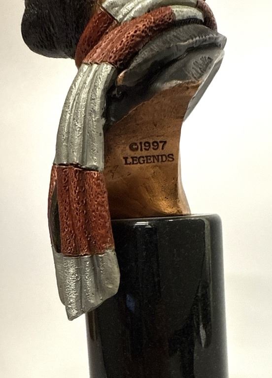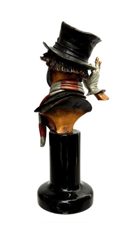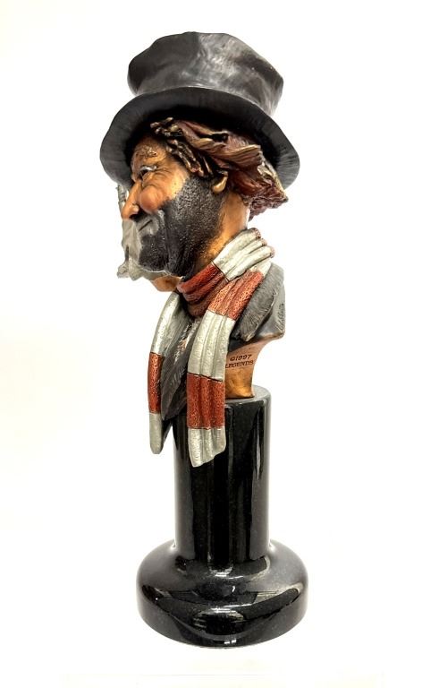 Item/Description: "A Tribute to Freddie" mixed media sculpture by artist Peter Apsit (American, 1937-1999) based on Red Skelton's character Freddie the Freeloader. It was issued by Legends in 1997-98. The sculpture is a limited edition piece, with only 999 produced. The character depicted is Freddie the Freeloader, one of Skelton's most famous characters.