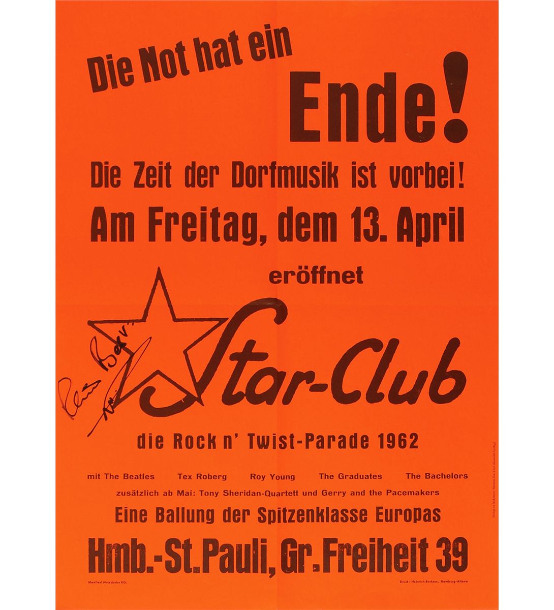 Color 16.25 x 22.75 reproduction concert for a season at The Star Club, Hamburg, featuring The Beatles, signed in black felt tip. In fine condition, with central horizontal and vertical fold and a few creases. Accompanied by a certificate of authenticity from Tracks.