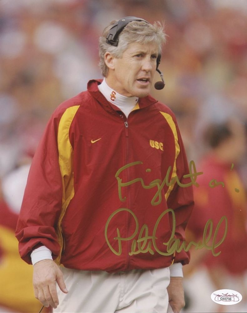 Hand-signed and inscribed in gold paint-pen by Pete Carroll. Autograph includes an official James Spence Authentication (JSA) hologram and matching COA for authenticity purposes.