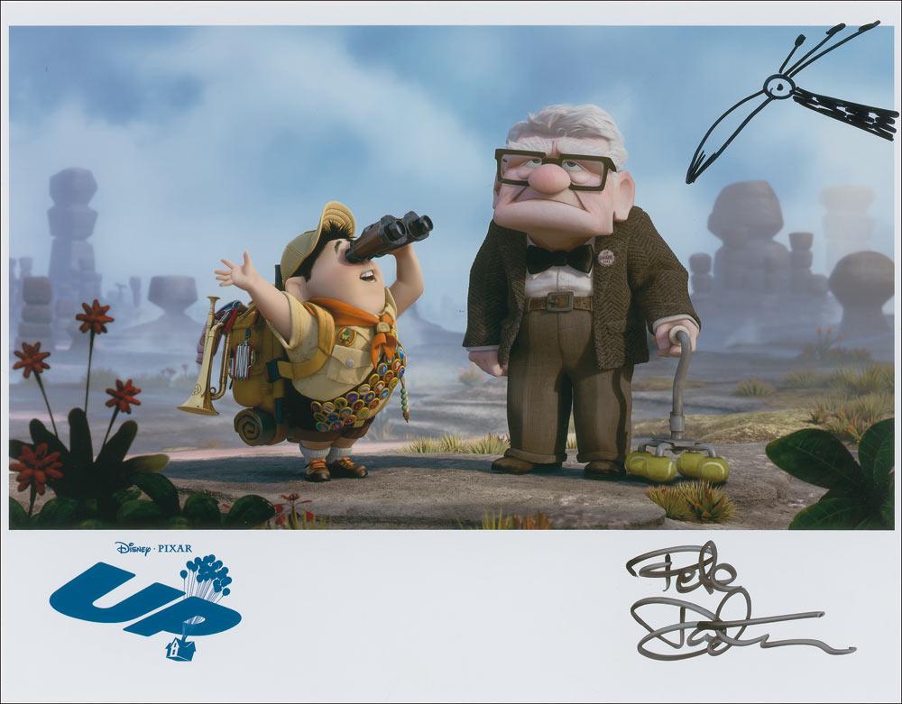 Color glossy 11 x 8.5 promotional photo for Up, signed in black felt tip by Docter, who adds a sketch of a bird from the movie along the right side. In fine condition.