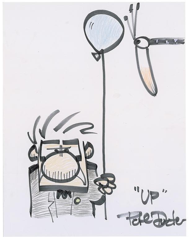 Original signed felt tip sketch of Carl Fredrickson and a bird from Up on an off-white 8.5 x 11 card, signed at the bottom, “’Up’ Pete Docter.“ In fine condition.